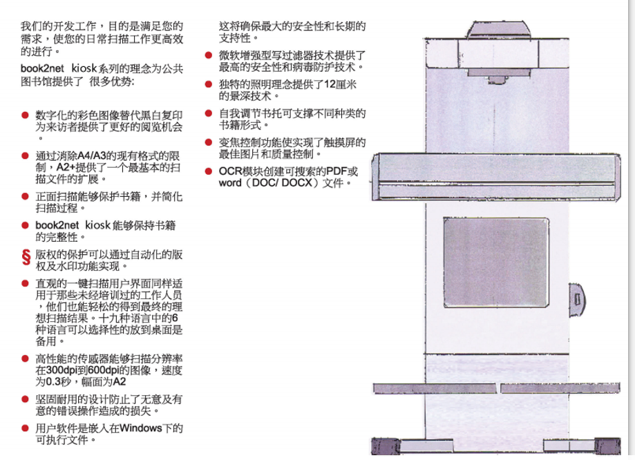 *7、提供12個(gè)月保修,維護(hù)簡(jiǎn)便,無(wú)需校驗(yàn),拆箱即用。保證在掃描過(guò)程不對(duì)書刊的裝訂造成損壞,要求標(biāo)配輕薄型高精度樹脂玻璃稿臺(tái)。